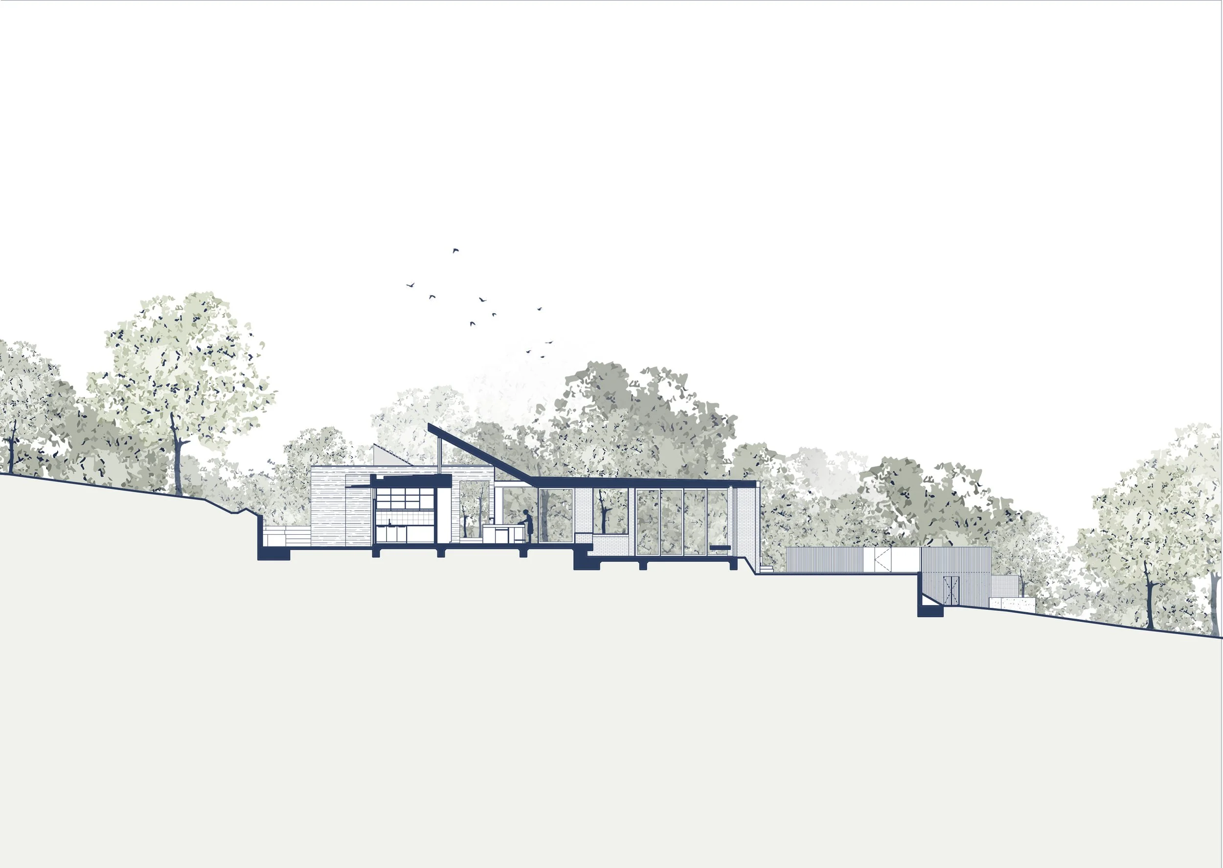 The house climbs gently with the land, rising through layers of living — from kitchen to pool terrace to a quiet den — until it opens to a library above the trees, its folded roofline framing distant views.